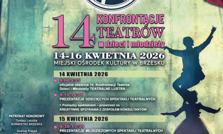 Miejski Ośrodek Kultury w Brzesku oraz Małopolskie Centrum Kultury „Sokół” w Nowym Sączu serdecznie zapraszają na Brzeskie Święto Teatru – 14. Konfrontacje Teatrów Dzieci i Młodzieży „TEATRALNE LUSTRA”. Wydarzenie odbędzie się na scenie MOK w Brzesku i zgromadzi młodych aktorów z powiatów: brzeskiego, tarnowskiego i dąbrowskiego.
