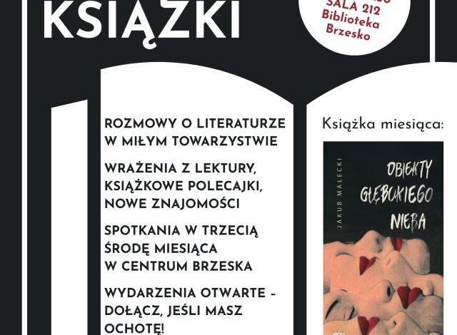 Brzeski Klub Książki, inicjatywa lokalna powstała z miłości do literatury oraz potrzeby wartościowych interakcji i rozmów, oraz brzeska biblioteka zapraszają na kolejne spotkanie dyskusyjne. Stały termin spotkań to trzecia środa miesiąca, najbliższe odbędzie się zatem 18 lutego o godz. 17:30. Motywem przewodnim wydarzenia będzie najnowsza powieść Jakuba Małeckiego – „Obiekty głębokiego nieba” od Wydawnictwa SQN. Spotkanie BKK jak zawsze na charakter otwarty – zapraszamy każdego, kto chce podzielić się swoimi spostrzeżeniami lub po prostu posłuchać dyskusji. Brzeski Klub Książki stanowi przestrzeń na swobodną wymianę opinii o lekturze, poznanie nowych autorów i rozmowę o literaturze w kameralnym gronie.