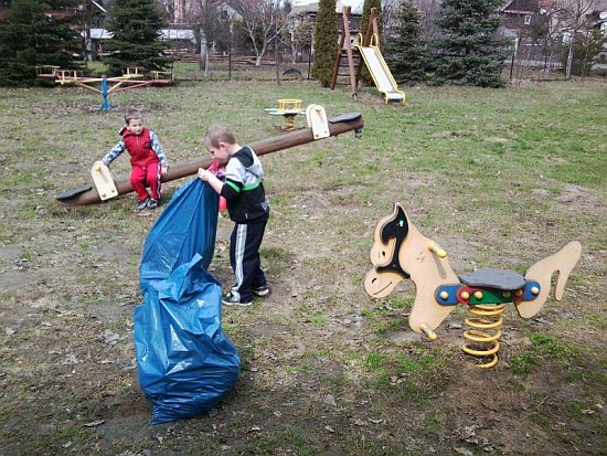 A pomysł ze zbieraniem plastikowych nakrętek był Huberta – bo jak sam mówił zaniesie je do przedszkola gdzie stoi specjalny kosz. Zaangażowana była również pani Paprocka która użyczyła nam sprzętu do wyrównania kretówek. Słowa uznania należą się dla mojej koleżanki – Basi Urbańskiej, która wyławiała worki ze śmieciami ze strumyka płynącego obok placu. Muszę jednak przyznać, że to dzieci nas wyciągnęły na akcję – dodaje na koniec Agnieszka.